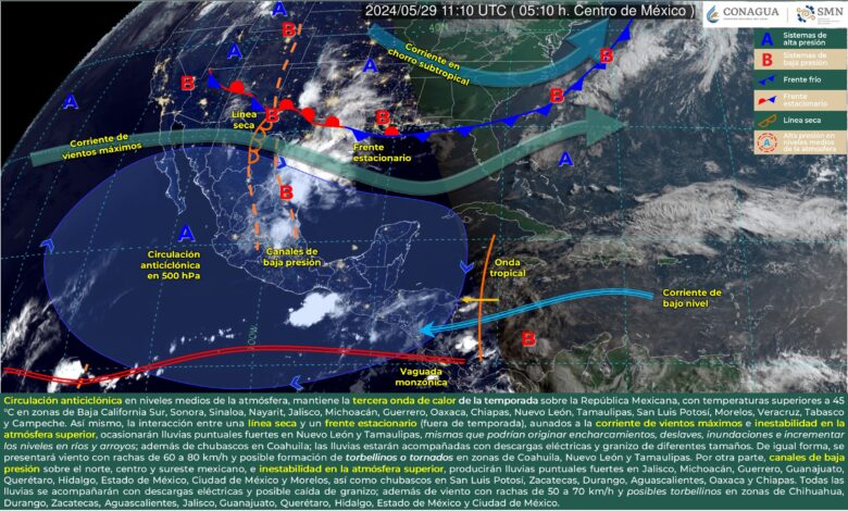 Redacción Xalapa.-Este miércoles, la circulación anticiclónica posicionada en niveles medios de la atmósfera, mantendrá la tercera onda de calor de la temporada sobre la República Mexicana, con temperaturas superiores a los 45 °C en zonas de Baja California Sur, Sonora, Sinaloa, Nayarit, Jalisco, Michoacán, Guerrero, Oaxaca, Chiapas, Nuevo León, Tamaulipas, San Luis Potosí, Morelos, Veracruz, Tabasco y Campeche.