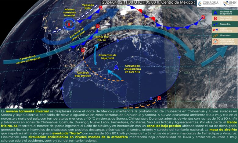 A su vez, ocasionará ambiente frío a muy frío en el noroeste y norte del país; con temperaturas menores a -10 °C en sierras de Sonora, Chihuahua y Durango, además de vientos con rachas de 70 a 90 km/h y tolvaneras en zonas de Chihuahua, Coahuila, Durango, Nuevo León, Tamaulipas, Zacatecas, San Luis Potosí y Aguascalientes. Al final del día, la novena tormenta invernal se moverá hacia el centro de Estados Unidos y dejará de afectar a México.