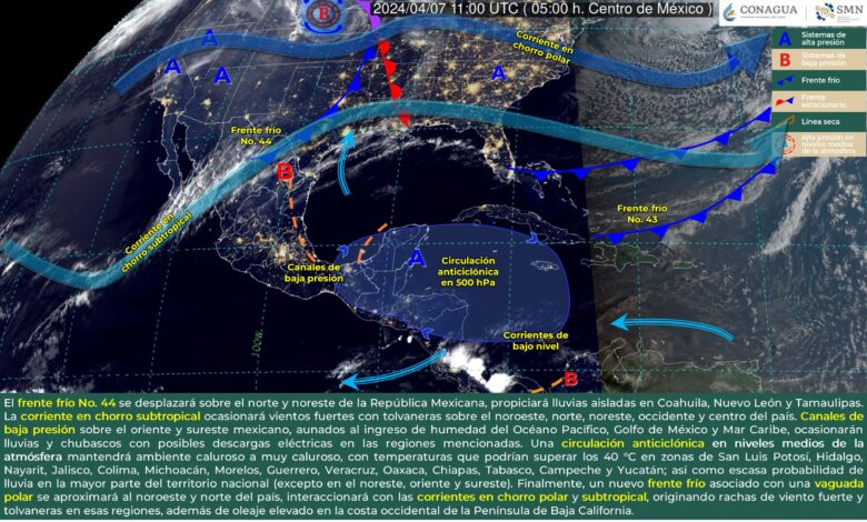 Redacción Xalapa.-Este día, el frente frío No. 44 se desplazará sobre el norte y noreste de la República Mexicana, propiciará lluvias aisladas en Coahuila, Nuevo León y Tamaulipas. La corriente en chorro subtropical ocasionará vientos fuertes con tolvaneras sobre el noroeste, norte, noreste, occidente y centro del país. Canales de baja presión sobre el oriente y sureste mexicano, aunados al ingreso de humedad del Océano Pacífico, Golfo de México y Mar Caribe, ocasionarán lluvias y chubascos con posibles descargas eléctricas en las regiones mencionadas.