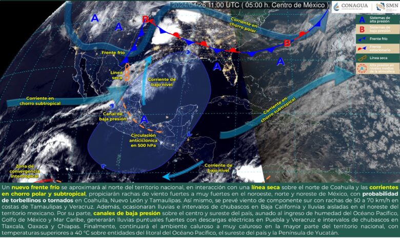 Redacción Xalapa.-Para hoy, un nuevo frente frío que se aproximará al norte del territorio nacional, en interacción con una línea seca sobre el norte de Coahuila y las corrientes en chorro polar y subtropical, propiciarán rachas de viento fuertes a muy fuertes en el noroeste, norte y noreste de México, con probabilidad de torbellinos o tornados en Coahuila, Nuevo León y Tamaulipas.