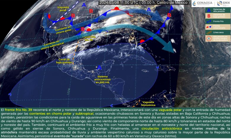 Redacción Xalapa.-Este día, el frente frío No. 39 recorrerá el norte y noreste de la República Mexicana, interaccionará con una vaguada polar y con la entrada de humedad generada por las corrientes en chorro polar y subtropical, ocasionando chubascos en Sonora y lluvias aisladas en Baja California y Chihuahua; también, persistirán las condiciones para la caída de aguanieve en las primeras horas de este día en zonas altas de Sonora y Chihuahua; rachas de viento de hasta 90 km/h en Chihuahua y Durango; así como viento de componente norte de hasta 80 km/h y tolvaneras en estados del norte y noreste del país.