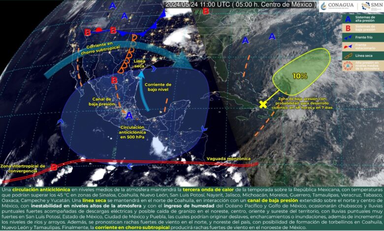 Para hoy, una circulación anticiclónica en niveles medios de la atmósfera mantendrá la tercera onda de calor de la temporada sobre la República Mexicana, con temperaturas que podrían superar los 45 °C en zonas de Sinaloa, Coahuila, Nuevo León, San Luis Potosí, Nayarit, Jalisco, Michoacán, Morelos, Guerrero, Tamaulipas, Veracruz, Tabasco, Oaxaca, Campeche y Yucatán. A su vez, una línea seca se mantendrá en el norte de Coahuila, en interacción con un canal de baja presión extendido sobre el norte y centro de México, con inestabilidad en niveles altos de la atmósfera y con el ingreso de humedad del Océano Pacífico y Golfo de México, ocasionarán chubascos y lluvias puntuales fuertes acompañadas de descargas eléctricas y posible caída de granizo en el noreste, centro, oriente y sureste del territorio, con lluvias puntuales muy fuertes en San Luis Potosí, Estado de México, Ciudad de México y Puebla, las cuales podrían originar deslaves, encharcamientos o inundaciones, además de incrementar los niveles de ríos y arroyos. Además, se pronostican rachas fuertes de viento en el norte y noreste del país, con posibilidad de formación de torbellinos en Coahuila, Nuevo León y Tamaulipas. Finalmente, la corriente en chorro subtropical producirá rachas fuertes de viento en el noroeste de México.