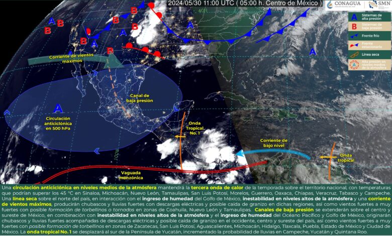 Finalmente, la onda tropical No. 1 se desplazará al sur de la Península de Yucatán, incrementado la probabilidad de lluvias en Campeche, Yucatán y Quintana Roo.