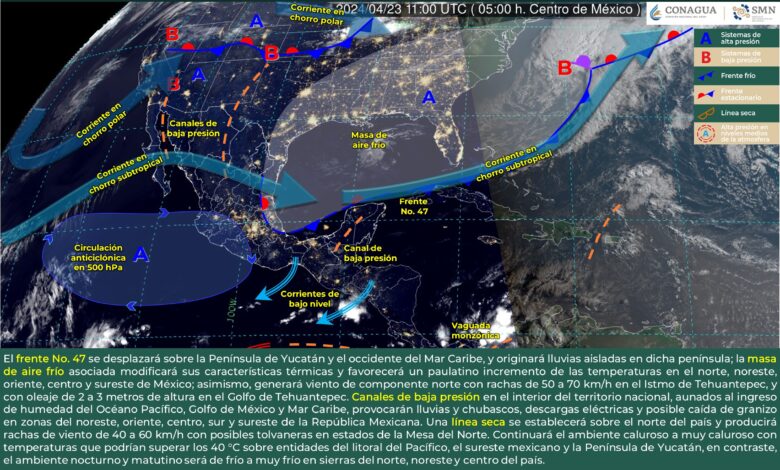 Redacción Xalapa.-Este día, el frente No. 47 se desplazará sobre la Península de Yucatán y el occidente del Mar Caribe, y originará lluvias aisladas en dicha península; la masa de aire frío asociada modificará sus características térmicas y favorecerá un paulatino incremento de las temperaturas en el norte, noreste, oriente, centro y sureste de México.