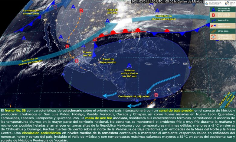 La masa de aire frío asociada al frente modificará sus características térmicas, permitiendo el ascenso de las temperaturas diurnas en la mayor parte del territorio nacional. No obstante, se mantendrá el ambiente frío a muy frío durante la mañana y noche, con posibles heladas al amanecer en zonas altas del noroeste, norte, noreste, centro y oriente de la República Mexicana y con temperaturas mínimas gélidas, menores a -5 °C en sierras de Chihuahua y Durango.