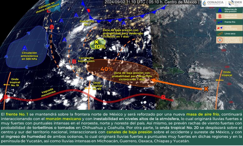 Así mismo, se prevén rachas de viento fuertes con probabilidad de torbellinos o tornados en Chihuahua y Coahuila. Por otra parte, la onda tropical No. 20 se desplazará sobre el centro y sur del territorio nacional, interaccionará con canales de baja presión sobre el occidente y sureste de México, y con el ingreso de humedad de ambos océanos, lo cual originará lluvias fuertes a puntuales muy fuertes en dichas regiones y en la península de Yucatán, así como lluvias intensas en Michoacán, Guerrero, Oaxaca, Chiapas y Yucatán.