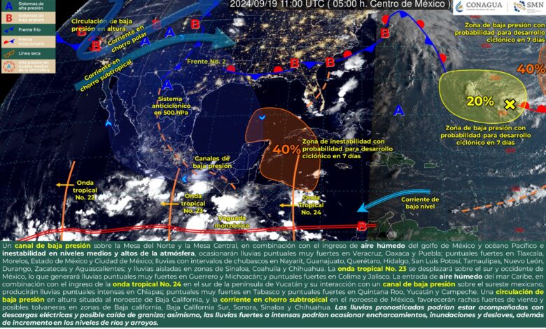 A su vez, la onda tropical No. 23 se desplazará sobre el sur y occidente de México, lo que generará lluvias puntuales muy fuertes en Guerrero y Michoacán; y puntuales fuertes en Colima y Jalisco.