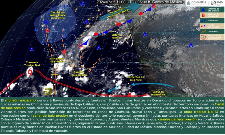 La onda tropical No. 13 frente a las costas de Jalisco y Colima, en interacción con un canal de baja presión en el occidente del territorio nacional, generarán lluvias puntuales intensas en Nayarit, Jalisco, Colima y Michoacán; lluvias puntuales muy fuertes en Guerrero y Aguascalientes.