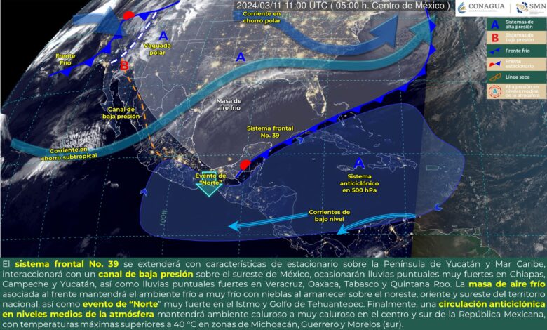Redacción Xalapa.-Para hoy, el sistema frontal No. 39 se extenderá con características de estacionario sobre la Península de Yucatán y Mar Caribe, interaccionará con un canal de baja presión sobre el sureste de México, ocasionarán lluvias puntuales muy fuertes en Chiapas, Campeche y Yucatán, así como lluvias puntuales fuertes en Veracruz, Oaxaca, Tabasco y Quintana Roo.