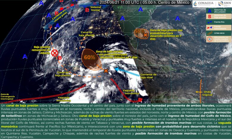 Por otra parte, la vaguada monzónica continuará frente al Pacífico Sur Mexicano, e interaccionará con una zona de baja presión con probabilidad para desarrollo ciclónico que se localiza al sur de la Península de Yucatán, lo que mantendrá el temporal de lluvias puntuales torrenciales en zonas de Oaxaca y Guerrero, y puntuales intensas en Quintana Roo, Yucatán, Campeche y Chiapas, además de rachas fuertes de viento y posible formación de trombas marinas en costas de Yucatán, Campeche y Guerrero.