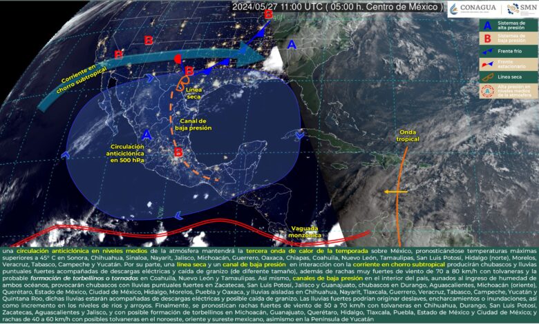 Redacción Xalapa.-Durante este lunes, una circulación anticiclónica en niveles medios de la atmósfera mantendrá la tercera onda de calor de la temporada sobre México, pronosticándose temperaturas máximas superiores a 45° C en Sonora, Chihuahua, Sinaloa, Nayarit, Jalisco, Michoacán, Guerrero, Oaxaca, Chiapas, Coahuila, Nuevo León, Tamaulipas, San Luis Potosí, Hidalgo (norte), Morelos, Veracruz, Tabasco, Campeche y Yucatán.