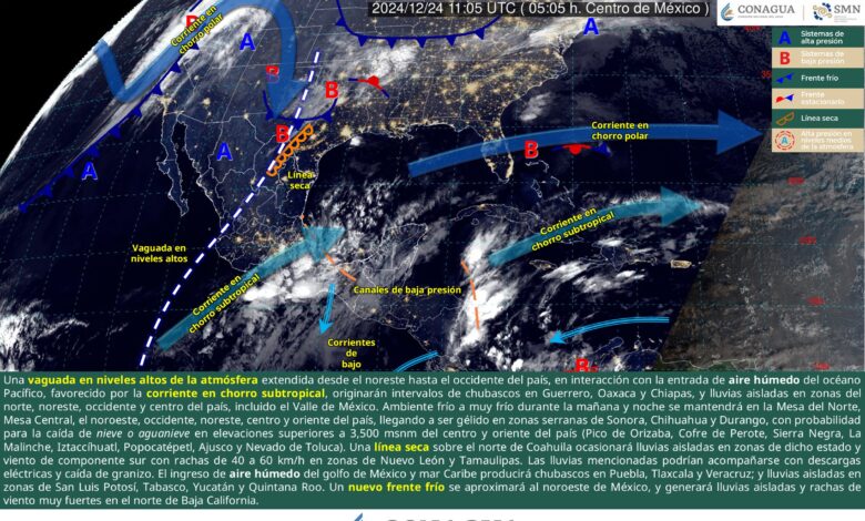 Para hoy, una vaguada en niveles altos de la atmósfera extendida desde el noreste hasta el occidente del país, en interacción con la entrada de aire húmedo del océano Pacífico, favorecido por la corriente en chorro subtropical, originarán intervalos de chubascos en Guerrero, Oaxaca y Chiapas, y lluvias aisladas en zonas de Nuevo León, San Luis Potosí, Tamaulipas, Jalisco, Colima, Michoacán, Guanajuato, Querétaro, Hidalgo, Morelos, Estado de México y Ciudad de México. Por otra parte, se mantendrá el ambiente frío a muy frío durante la mañana y noche en la Mesa del Norte, Mesa Central, el noroeste, occidente, noreste, centro y oriente del país, llegando a ser gélido en zonas serranas de Sonora, Chihuahua y Durango, y con probabilidad para la caída de nieve o aguanieve en elevaciones superiores a 3,500 msnm del centro y oriente del país (Pico de Orizaba, Cofre de Perote, Sierra Negra, La Malinche, Iztaccíhuatl, Popocatépetl, Ajusco y Nevado de Toluca). Una línea seca sobre el norte de Coahuila ocasionará lluvias aisladas en zonas de dicho estado y viento de componente sur con rachas de 40 a 60 km/h en zonas de Nuevo León y Tamaulipas. Las lluvias antes mencionadas podrían acompañarse con descargas eléctricas y caída de granizo. A su vez, el ingreso de aire húmedo del golfo de México y mar Caribe producirá chubascos en Puebla, Tlaxcala y Veracruz; y lluvias aisladas en zonas de San Luis Potosí, Tabasco, Yucatán y Quintana Roo. Finalmente, un nuevo frente frío se aproximará al noroeste de México, y generará lluvias aisladas y rachas de viento muy fuertes en el norte de Baja California.