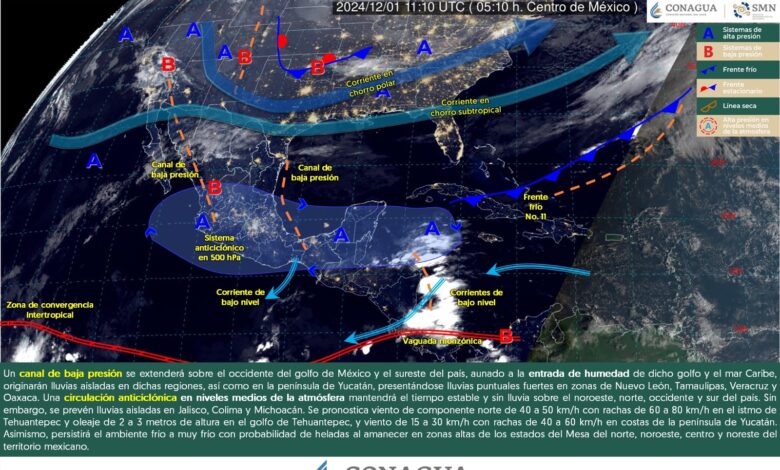 Por su parte, una circulación anticiclónica en niveles medios de la atmósfera mantendrá el tiempo estable y sin lluvia sobre el noroeste, norte, occidente y sur del país. Sin embargo, se prevén lluvias aisladas en Jalisco, Colima y Michoacán. Finalmente se pronostica viento de componente norte de 40 a 50 km/h con rachas de 60 a 80 km/h en el istmo de Tehuantepec y oleaje de 2 a 3 metros de altura en el golfo de Tehuantepec, y viento de 15 a 30 km/h con rachas de 40 a 60 km/h en costas de la península de Yucatán. Asimismo, persistirá el ambiente frío a muy frío con probabilidad de heladas al amanecer en zonas altas de los estados del Mesa del norte, noroeste, centro y noreste del territorio mexicano.