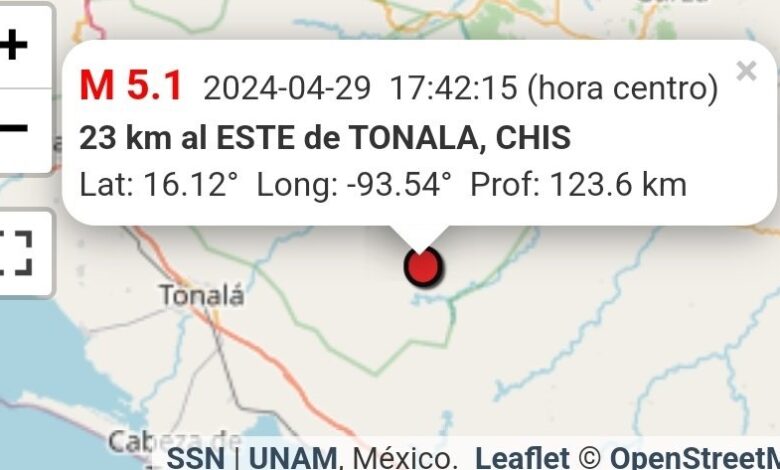 Se reporta un sismo de 5.7 de magnitud en Chiapas