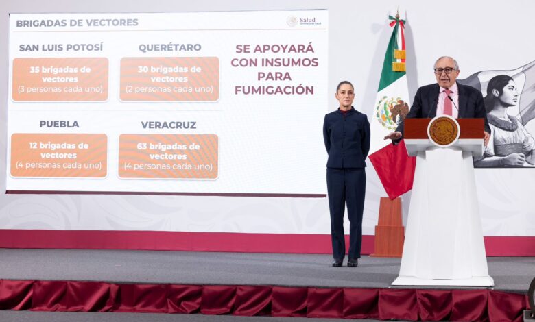 Kershenobich destacó que, tras las lluvias, el riesgo de dengue aumenta, por lo que se reforzarán las acciones de fumigación y limpieza en la Huasteca hidalguense, potosina, queretana, poblana y veracruzana.