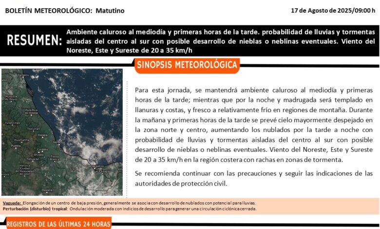 Durante la mañana y primeras horas de la tarde se prevé cielo mayormente despejado en la zona norte y centro, aumentando los nublados por la tarde a noche con probabilidad de lluvias y tormentas aisladas del centro al sur con posible desarrollo de nieblas o neblinas eventuales. Viento del Noreste, Este y Sureste de 20 a 35 km/h en la región costera con rachas en zonas de tormenta.