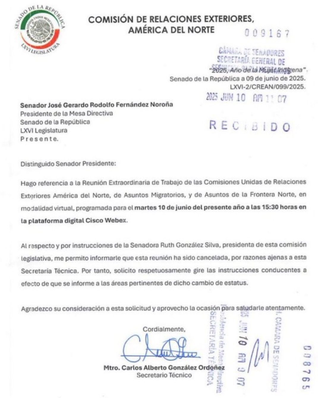 En el oficio dirigido a Gerardo Fernández Noroña, la senadora Ruth González Silva (PVEM), presidenta de la comisión, argumentó que la reunión virtual se suspendía “por razones ajenas”. Por su parte, el secretario técnico del grupo, Carlos Alberto González Ordóñez, solicitó comunicar el cambio a las áreas pertinentes.