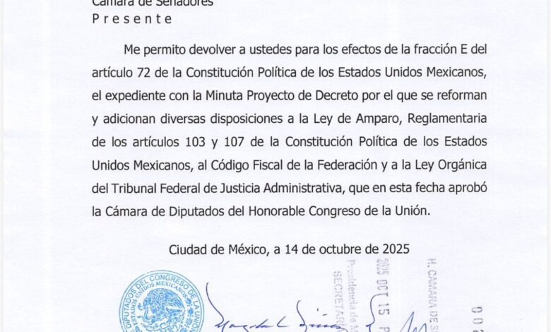 Carlos Guzmán | Corresponsal CDMX.– El Senado de la República recibió este miércoles la minuta de la reforma a la Ley de Amparo, luego de que la Cámara de Diputados aprobara anoche el dictamen con modificaciones al texto original, particularmente en los artículos 128, 129 y en los transitorios. Así lo informó la presidenta del Senado, Laura Itzel Castillo, quien detalló en su cuenta de X (@LauraI_Castillo) que el documento fue entregado poco antes de las 11:00 horas.