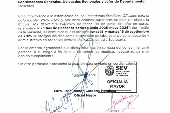 Después de tanta expectativa, el día de hoy, la Secretaría de Educación en Veracruz (SEV) dio un aviso oficial al respecto el Oficial Mayor de la dependencia, José Ramón Cardona Mendoza, entregó un comunicado en el que se confirmaba que los días 15 y 16 habría suspensión de clases para todos los niveles de educación básica, con motivo de las fiestas patrias de independencia.