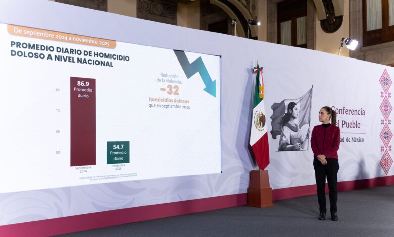 “Es la reducción más marcada en los últimos años; noviembre cerró con un promedio de 54.7 homicidios diarios, frente a los 86.9 registrados al inicio del gobierno”, señaló la funcionaria.