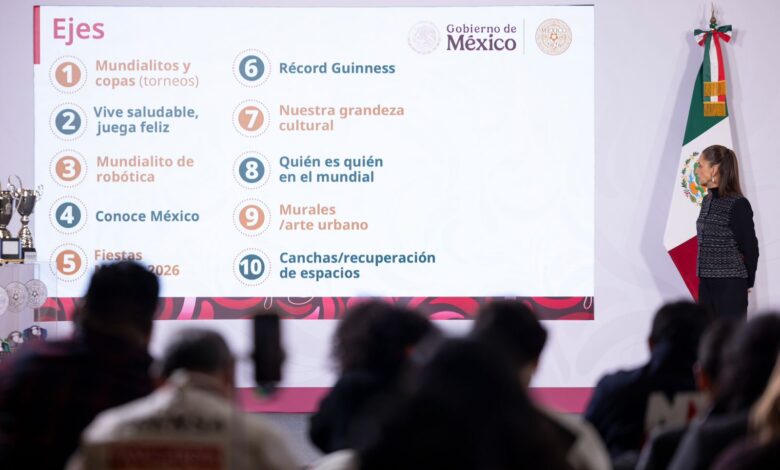 Rosa Icela Rodríguez explicó que los 10 ejes del Mundial Social México 2026 están orientados a fomentar hábitos saludables, el trabajo en equipo, la disciplina y el respeto, e incluyen iniciativas como Vive Saludable Juega Feliz, Mundialito de Robótica, Conoce México, Fiestas México 2026, Récord Guinness, Nuestra Grandeza Cultural, Murales de Arte Urbano y la recuperación de canchas y espacios públicos.
