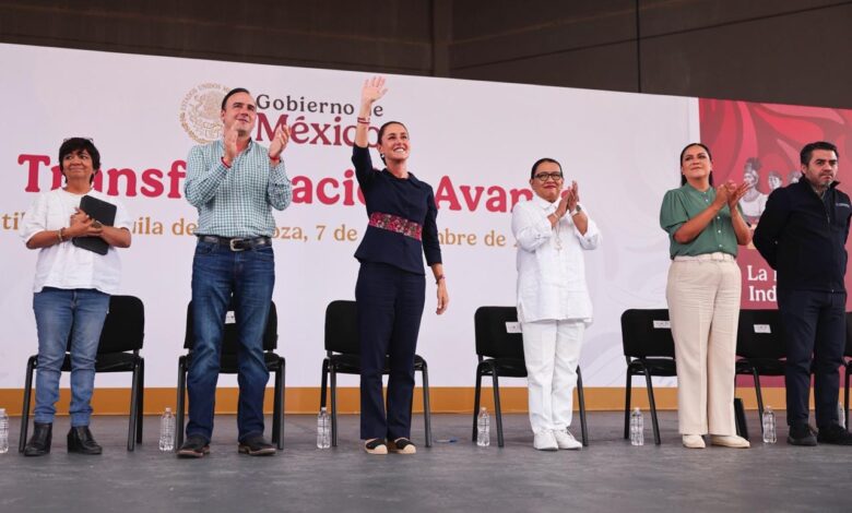Sheinbaum adelantó que el próximo martes se dará el banderazo de salida al Tren Saltillo–Nuevo Laredo, y destacó obras como la tecnificación del Distrito de Riego 017, la edificación de preparatorias y un campus de la Universidad Nacional Rosario Castellanos.