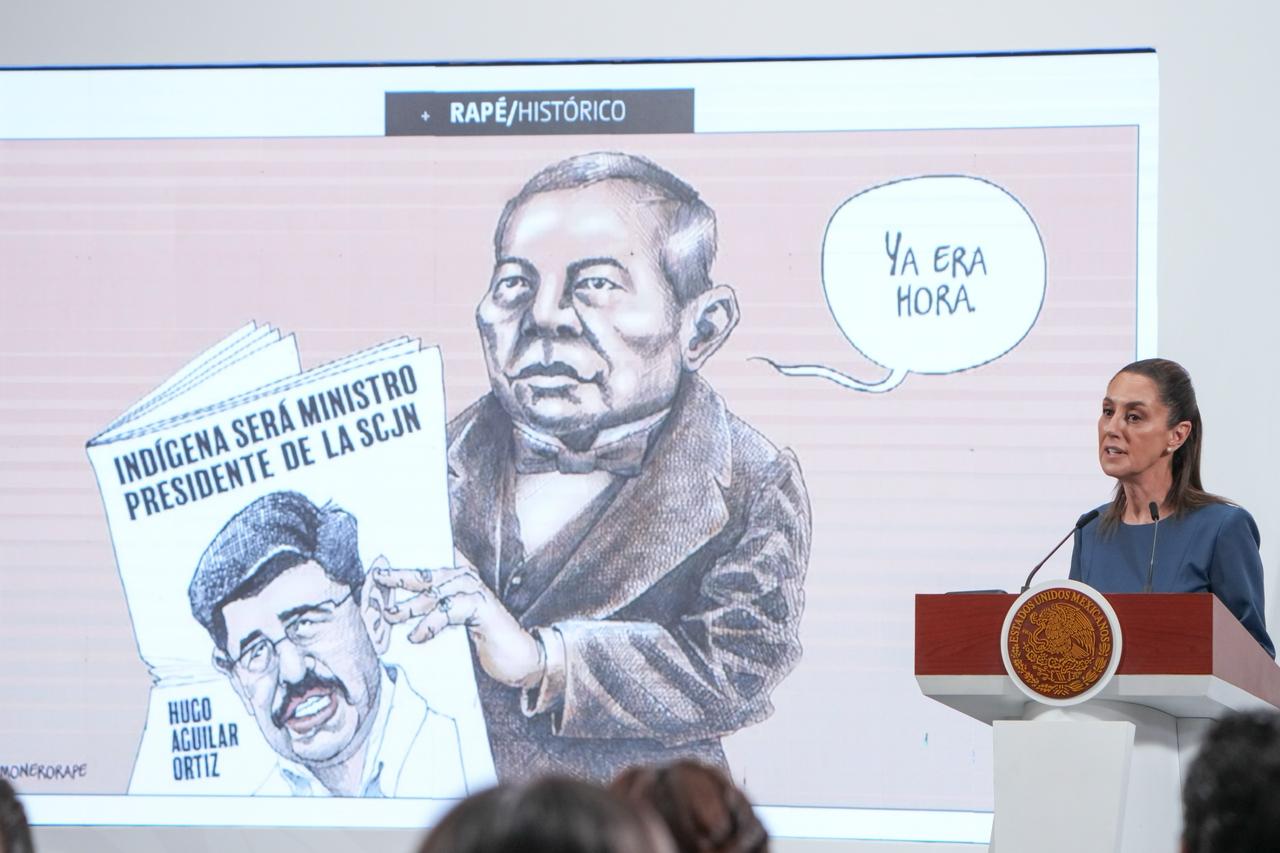 Recordándole el que ella había anticipado en al menos 3 ocasiones durante sus eventos por el país y una más en su Mañanera en Palacio Nacional el deseo de que llegara un indígena a la máxima magistratura de impartición de justicia en el país, pidió mostrar una caricatura del monero Raphé donde se puede leer la frase “ya era hora”, la cual secundó.