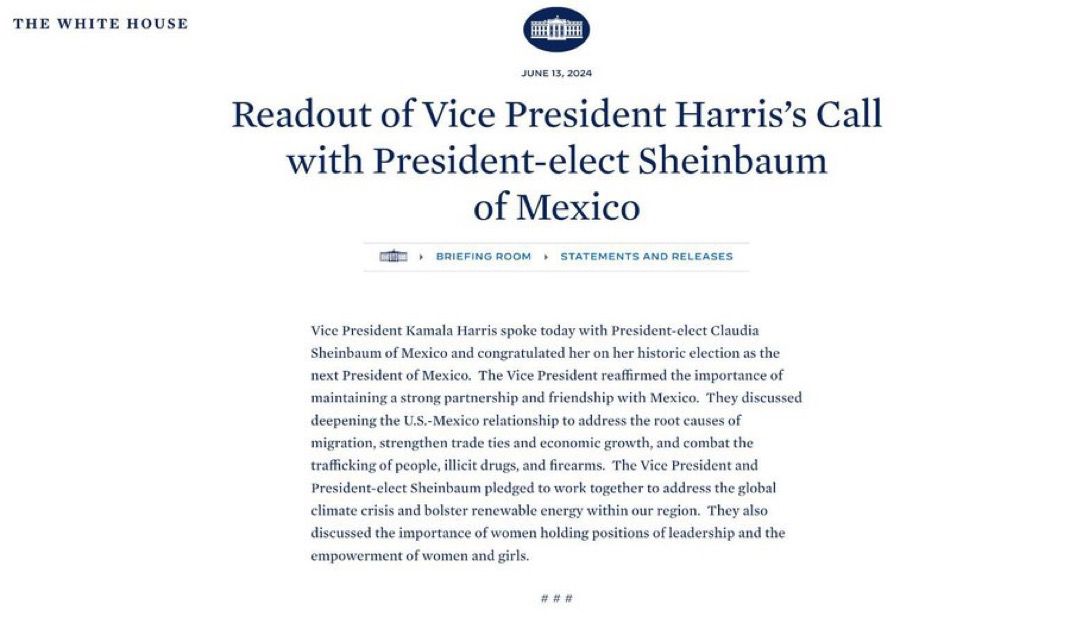 Harris felicitó nuevamente a Sheinbaum por su reciente victoria electoral y subrayó la importancia de mantener una sólida asociación y amistad con México, destacando que el país se ha convertido en el principal exportador de bienes a Estados Unidos. En un comunicado, la Casa Blanca afirmó que ambas líderes se comprometieron a fortalecer esta relación bilateral.