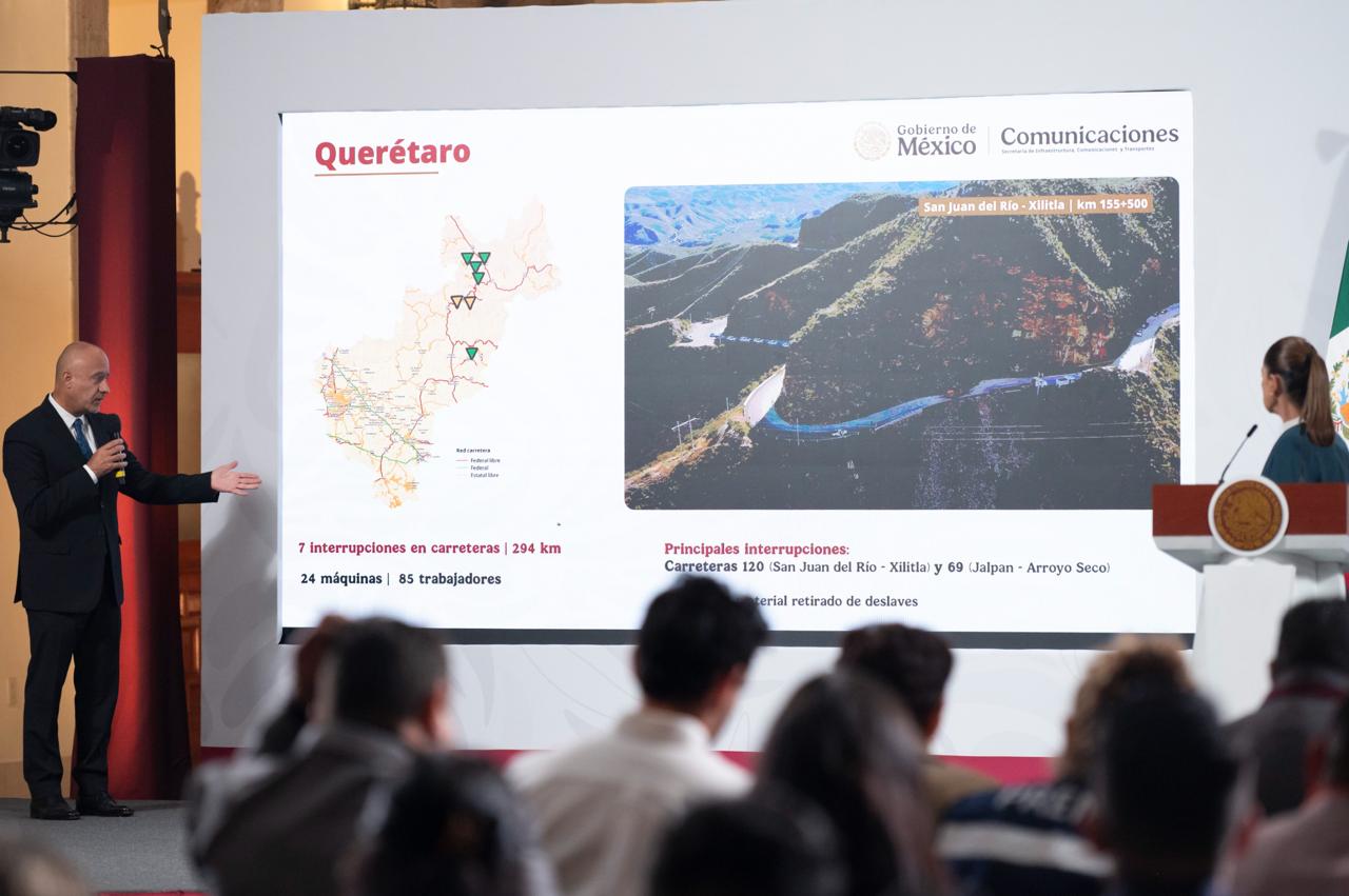 Querétaro presentó 7 interrupciones, principalmente en las carreteras 120 y 69, donde se removieron 13,600 metros cúbicos de material con 24 máquinas y 85 trabajadores.