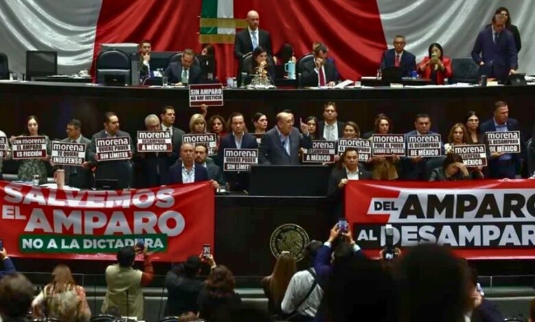 Durante la sesión, el debate se tornó intenso y simbólico. Legisladores de Morena desplegaron carteles con las frases “La Cuarta Transformación es justicia” y “No a los privilegios”, mientras que los del PRI mostraron mantas con lemas como “Del amparo al desamparo” y “Salvemos al amparo. No a la dictadura”. La mayoría oficialista rechazó tres mociones suspensivas presentadas por la oposición, que exigían corregir el contenido del dictamen.