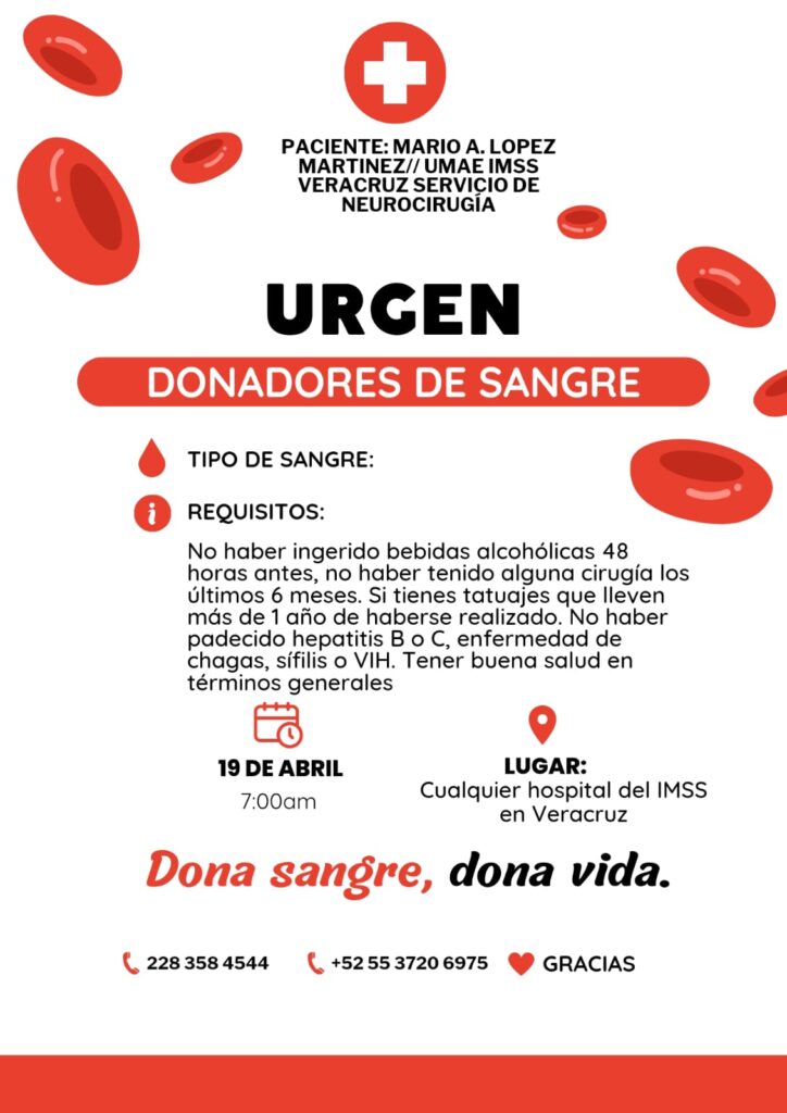Redacción Xalapa.-Familiares solicitaron donadores de sangre para el paciente Mario A. López Martínez del UMAE IMSS Veracruz Servicio de Neurología este viernes 19 de abril del 2024 a partir de las 07:00 horas.