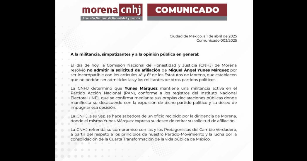 Es así que la Coordinadora de Morena, María Luisa Alcalde, compartió un comunicado a través de sus redes sociales donde se señala que el Comité Nacional de Honestidad y Justicia (CNHJ) de Morena, «resolvió no admitir la solicitud de afiliación de Miguel Ángel Yunes Márquez por ser incompatible con los artículos 4º y 6º de los estatuos de Morena.