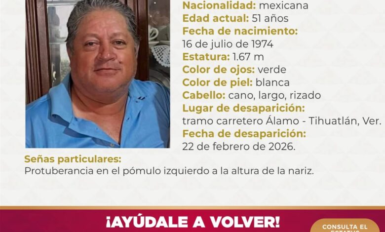 Juan David Castilla/Xalapa. Con el corazón roto y una desesperación que crece cada minuto, la familia de Bulmaro Herrera Bandala exigió a las autoridades que agilicen las investigaciones para localizar al hombre de 51 años, quien fue visto por última vez el pasado 22 de febrero, sobre la carretera Álamo-Tihuatlán, durante los narcobloqueos por la ejecución de Nemesio Oseguera Cervantes, alias “El Mencho”.