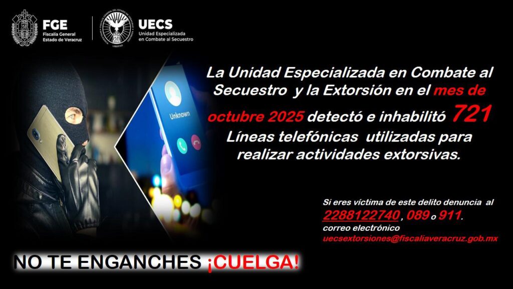 Finalmente, informaron que ante este delito se reciben las denuncias en el número telefónico 089 o a la Unidad Especializada en Combate al Secuestro y la Extorsión al número 2288122740.