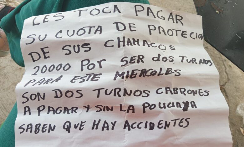 “Les toca pagar su cuota de protección de sus chamacos, 20 mil pesos por ser dos turnos para este miércoles. Son dos turnos cabrones a pagar y sin la policía ya saben que hay accidentes”, se leía en el mensaje.