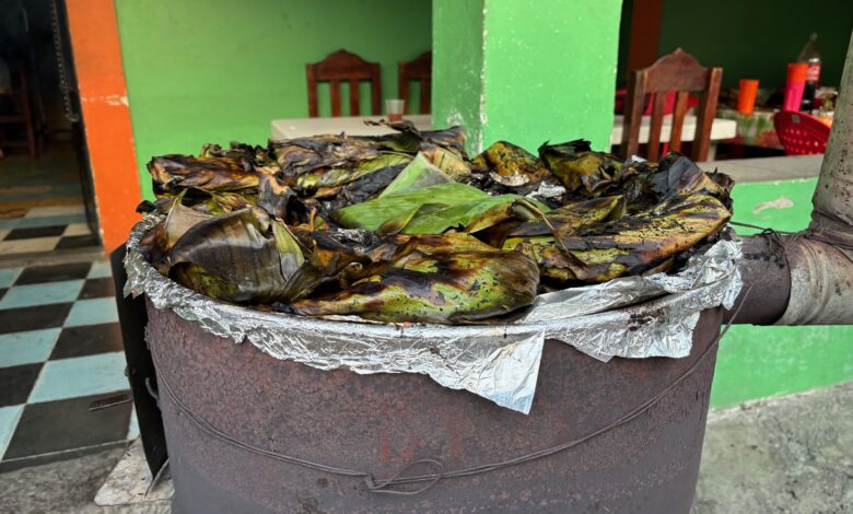 Destacan los tamales asados de salsa roja con costilla de cerdo y hoja de plátano, así como también, los tempispis, unas piezas de masa rellenas de frijol con polvo de aguacate y chile habanero o chiltepín.