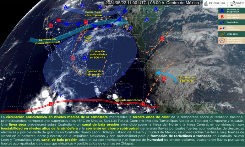 A su vez, una línea seca prevalecerá sobre Coahuila y un canal de baja presión extendido sobre la Mesa del Norte y la Mesa Central, en combinación con inestabilidad en niveles altos de la atmósfera y la corriente en chorro subtropical, generarán lluvias puntuales fuertes acompañadas de descargas eléctricas y posible caída de granizo en Coahuila, Nuevo León, Hidalgo, Estado de México y Ciudad de México, así como rachas fuertes a muy fuertes de viento en el noroeste, norte y noreste de la República Mexicana, y con probabilidad para la formación de torbellinos o tornados en Coahuila, Nuevo León y Tamaulipas. Finalmente, otro canal de baja presión sobre el sureste mexicano y el ingreso de humedad de ambos océanos, ocasionarán lluvias puntuales fuertes acompañadas de descargas eléctricas y posible caída de granizo en Chiapas.