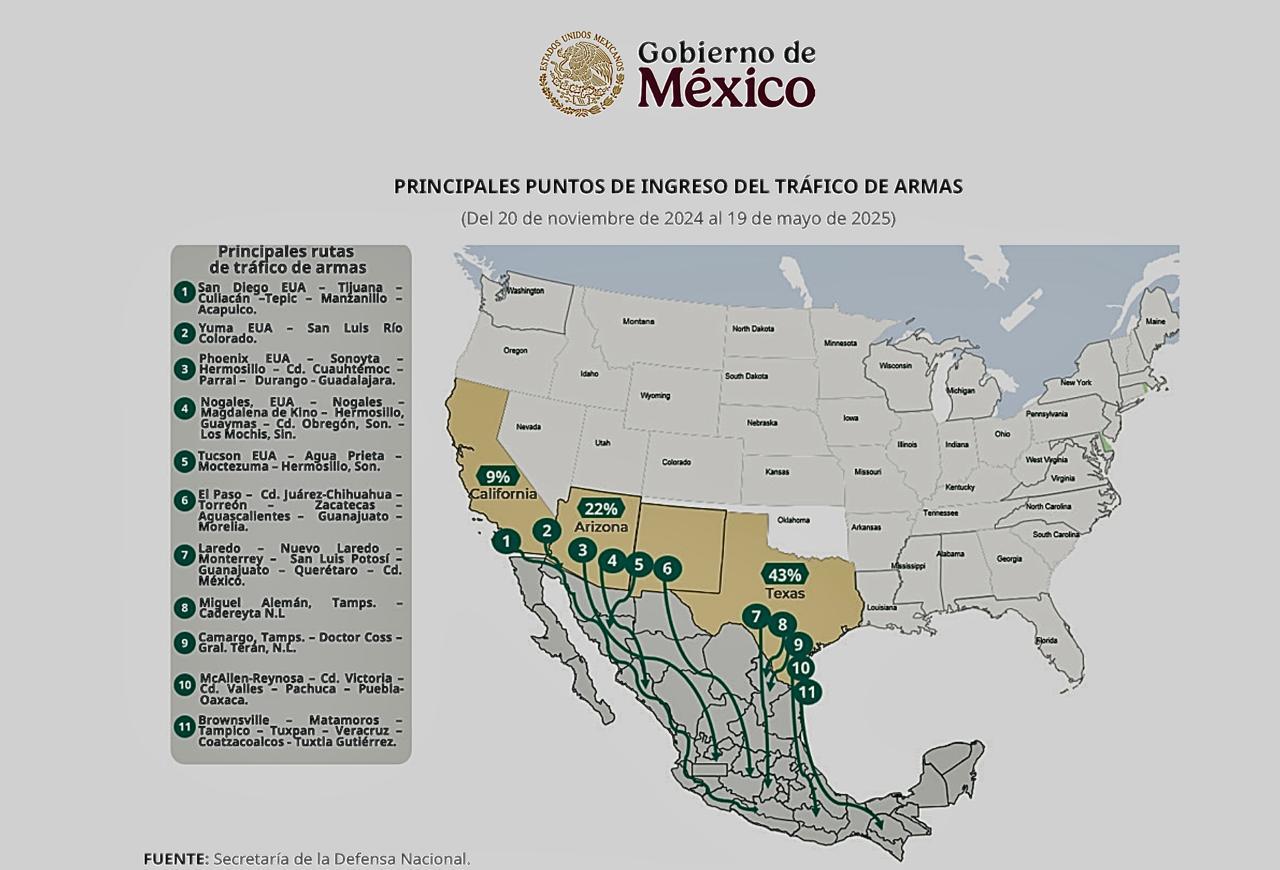 Carlos Guzmán | Corresponsal CDMX,- La Secretaría de la Defensa Nacional (Sedena) identificó a Texas como el principal punto de ingreso del tráfico de armas hacia México, pues concentra el 43 por ciento del flujo ilegal detectado entre el 20 de noviembre de 2024 y el 19 de mayo de 2025, según el Informe Semestral de la Fuerza Armada Permanente en Tareas de Apoyo a la Seguridad Pública, remitido por la Secretaría de Seguridad y Protección Ciudadana (SSPC) a la Comisión Permanente.