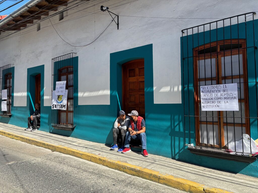 Los empleados colocaron lonas y pancartas sobre la fachada del “Seguro del Magisterio”, ubicadas sobre la calle Morelos, en la zona centro de la capital del estado.