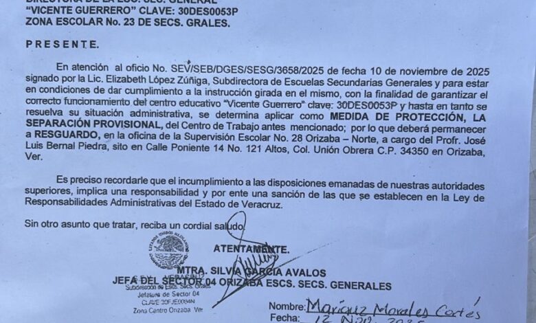 La tensión en el plantel aumentó debido a que, según documentos presentados por los padres de familia, la profesora Maricruz Morales quedó oficialmente bajo resguardo administrativo desde el 12 de noviembre de 2025.