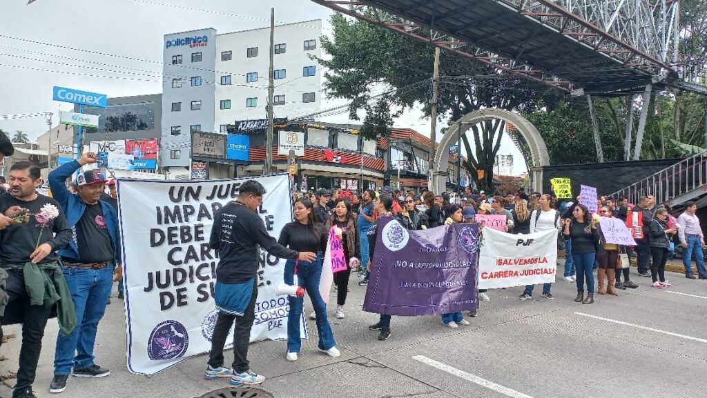 Juan David Castilla.- Trabajadores del Poder Judicial de la Federación (PJF) marcharon sobre la avenida Lázaro Cárdenas y protestaron afuera del Congreso de Veracruz, en la ciudad de Xalapa, donde se prevé que sea votada y aprobada la reforma judicial.