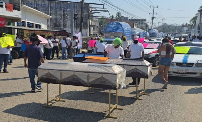 Los manifestantes colocaron sobre la carretera tres ataúdes, acompañados de mensajes contra la gobernadora morenista Evelyn Salgado Pineda, luego de los recientes ataques contra transportistas.