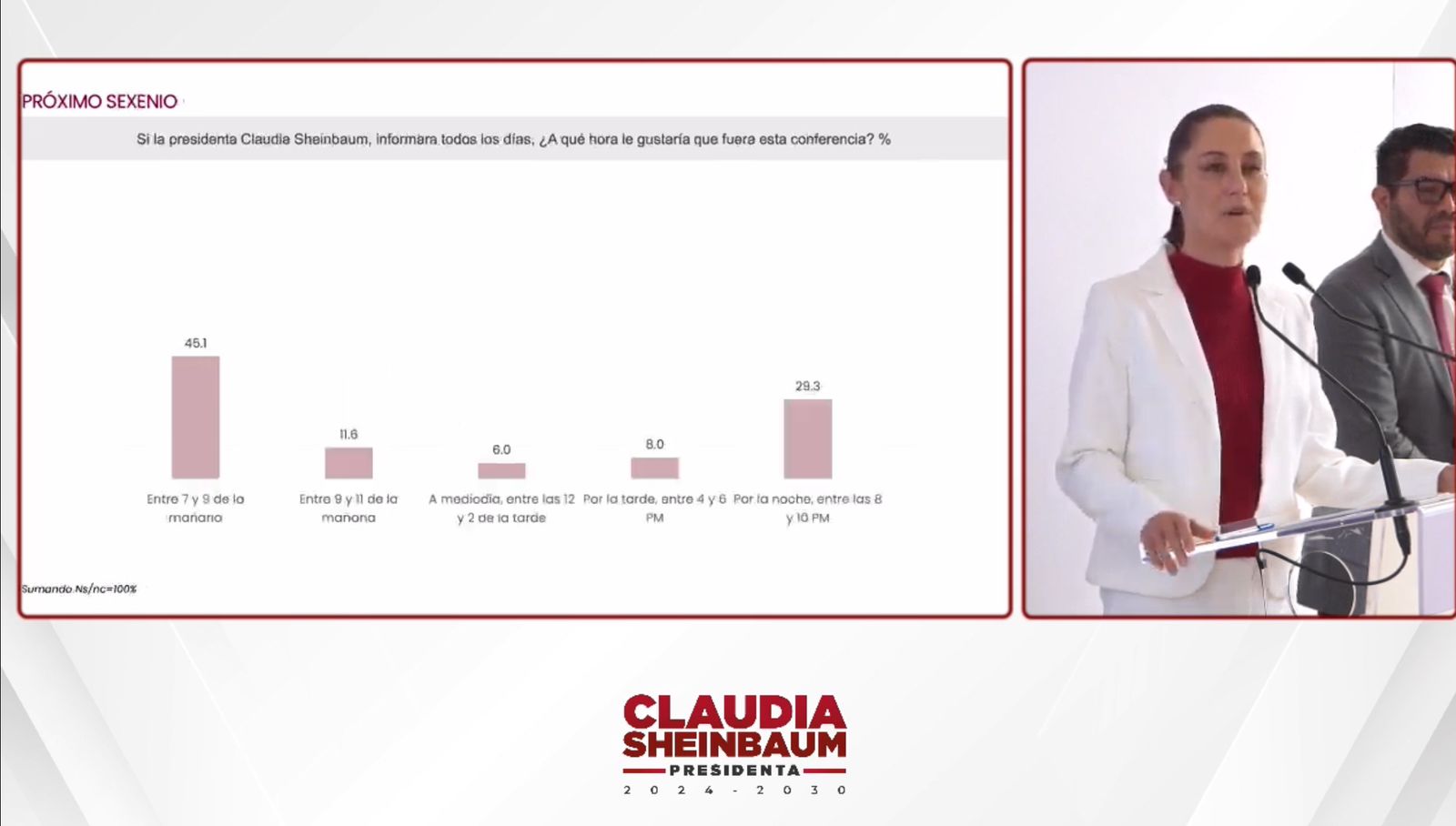 En el marco del anuncio del ministro en retiro, Arturo Zaldívar, Leticia Ramírez y de Carlos Augusto como parte de su gabinete ampliado, Sheinbaum Pardo informó que en la primera pregunta donde se cuestionó: ¿Pensando en el próximo sexenio, ¿cada cuánto le gustaría que la presidenta realice conferencias informativas? 33.1 por ciento de los encuestados contestó que diario; 25.9 por ciento dijo que dos veces por semana; y 28.2 por ciento, solo una vez.