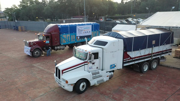 Con el escudo universitario como insignia y la leyenda “Acopio UNAM Solidaria”, dos camiones, cada uno con 20 toneladas de ayuda humanitaria, salieron este viernes rumbo a Guerrero. La ayuda se entregará al rector de la Universidad Autónoma de Guerrero (UAGro), Javier Saldaña.