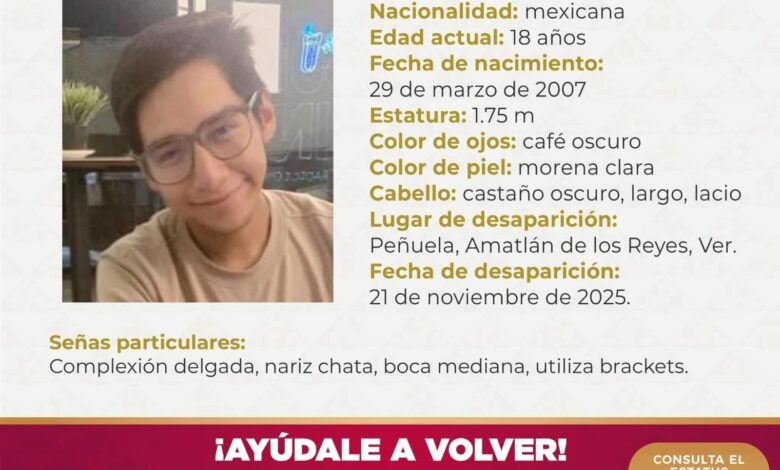 La Comisión Estatal de Búsqueda emitió una ficha de búsqueda por el joven de 18 años, ocurrida en la comunidad de Peñuela, municipio de Amatlán de los Reyes el 21 de noviembre de 2025.