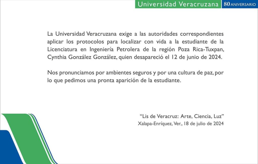 “Nos pronunciamos por ambientes seguros y por una cultura de paz, por lo que pedimos una pronta aparición de la estudiante”, se lee en un escueto comunicado emitido por la máxima casa de estudios de Veracruz.