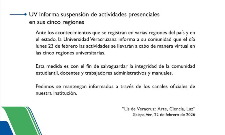 Redacción. Xalapa, Ver.- La Universidad Veracruzana (UV) suspendió actividades presenciales en todas sus regiones, derivado de los hechos de violencia en respuesta al abatimiento del líder del Cartel de Jalisco Nueva Generación (CJNG), Nemesio Oseguera «El Mencho».