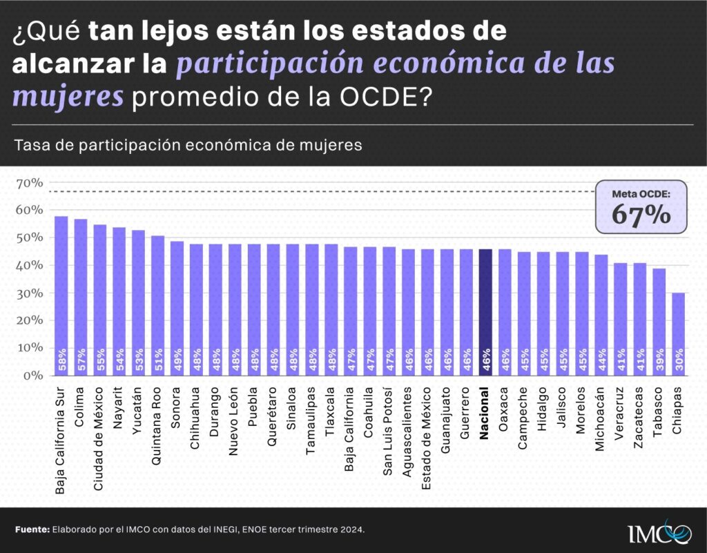 “Alcanzar una participación económica de 67% entre las mujeres implica distintos niveles de esfuerzo para las entidades del país. Mientras que Baja California Sur, Colima y Ciudad de México registran una participación económica cercana a 60%, en Chiapas o Tabasco esta cifra se ubica por debajo de 40%”, se lee en el informe del IMCO.
