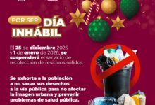 Xalapa, Ver.- El Ayuntamiento de Xalapa, a través de la Dirección de Limpia Pública, informa a la ciudadanía que por ser días inhábiles, el próximo 25 de diciembre y 1…