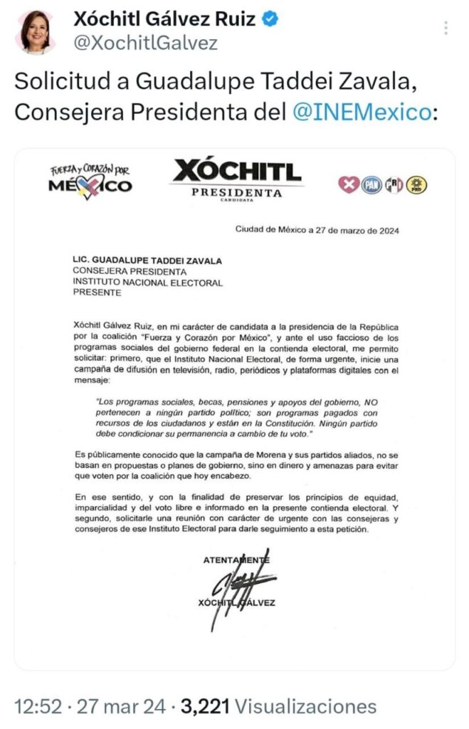 Redacción Xalapa.- La candidata a la presidencia este miércoles, presentó en sus redes sociales la solicitud que hizo al INE, para una campaña de difusión donde aclare que los programas sociales, becas, apoyos no pertenecen a ni un partido político.